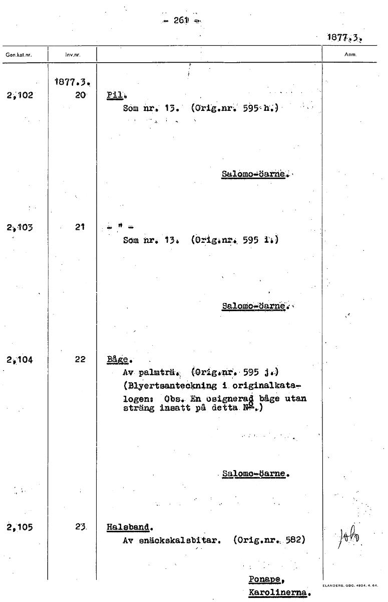 1 8 7 7 3 1877.3! 2,102 20 Pilb Som nr. 13. (Grig.nr4 595'11j Salomo.löarne_c;, 2003 21 's - Som nr, 13, ID Agånl.tk 595 14) Saloto-öarrid.', 2,104 22 Båge, , Av palmträ.1 (Origo:it, 595 j,) (Blyertsa...