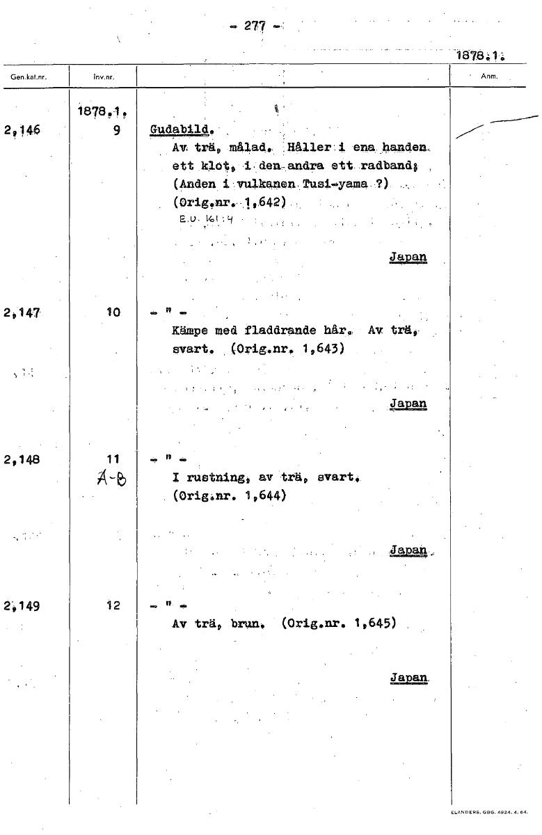 277 187841 18780! 2146 9 Gudabild, Av trä, målad,. ,Häller i ena..handen, ett kloto 'i. den-andra ett radbandb (Anden i vulkanen Tuei-yama.?) (4rignr.'.1 9642) Japan 2,147 10 Kämpe med fladdrande hår. Av trä,. svart* (Orig.nr. 1,643) Japan 2,148 1 rustning, av trä, svart. (origönr, 1,644) Japan, 2049 12 Av trä, brun. Orig.nr, 1,645) Japan, [ocr]