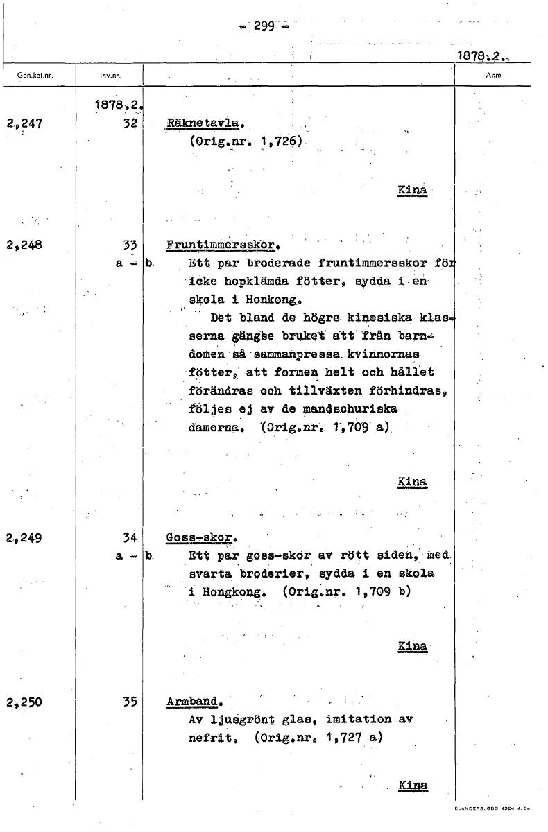 - 29.9 187812,_. 187842. 2,247 32 (Orig.nr. 1,726) Kina 2,246 33 Pruntimmhrsskbr. a- b.. Ett par broderade fruntimmersekor fö icke hopklämda fötter, sydda Le skola i Honkong.. Det bland de högre kinesiska klas serna gänglie bruket att från barn- domen Så'sammanpressa kvinnornas fötter, att formen helt och hållet förändras och tillväxten förhindras, följes ej av de mandschuriska damerna. (0rig.nrr. 1^,709 a), Kina 2.249 34 Goss-skor. a b. Ett par goss-skor av rött siden,' med svarta broderier, sydda i en skola 1 Hongkong. (Orig.nr. 1,709 b) Kina 2250 35 Armband. Av ljusgrönt glas, imitation av nefrit. (Orig.nr. 1,727 a) Kina [ocr]