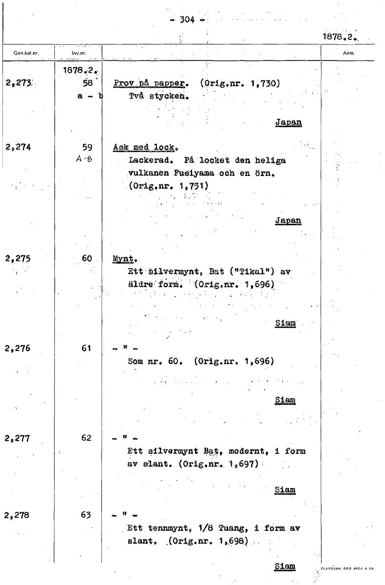 2274 59 Ask med lock* Lackerad. På locket den heliga vulkanen Fusiyama och en örn. (Orig.nr. 19731) • Japan 2,275 60 nto Ett'bilvermynt9 Dat ("Tikal") av äldre'f6rM. -(Orig,nr. 1,696) Siam 2,276 61 So...