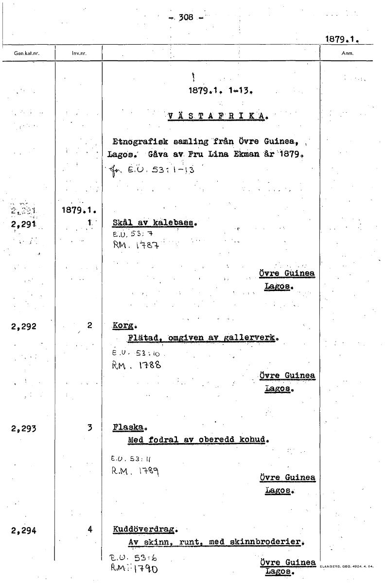 -.308- 1879.1. 1879.1. 1-13' VÄSTAPRIK A. Etnografisk samling från övre Guinea, Lagos.' Gåva av. Pru Lina Ekman år'1879. e.b..531 1879.1. 2,291 1 Skål av kalebass. ED, 5 3; -9- RskA övre Guinea Laos. ...