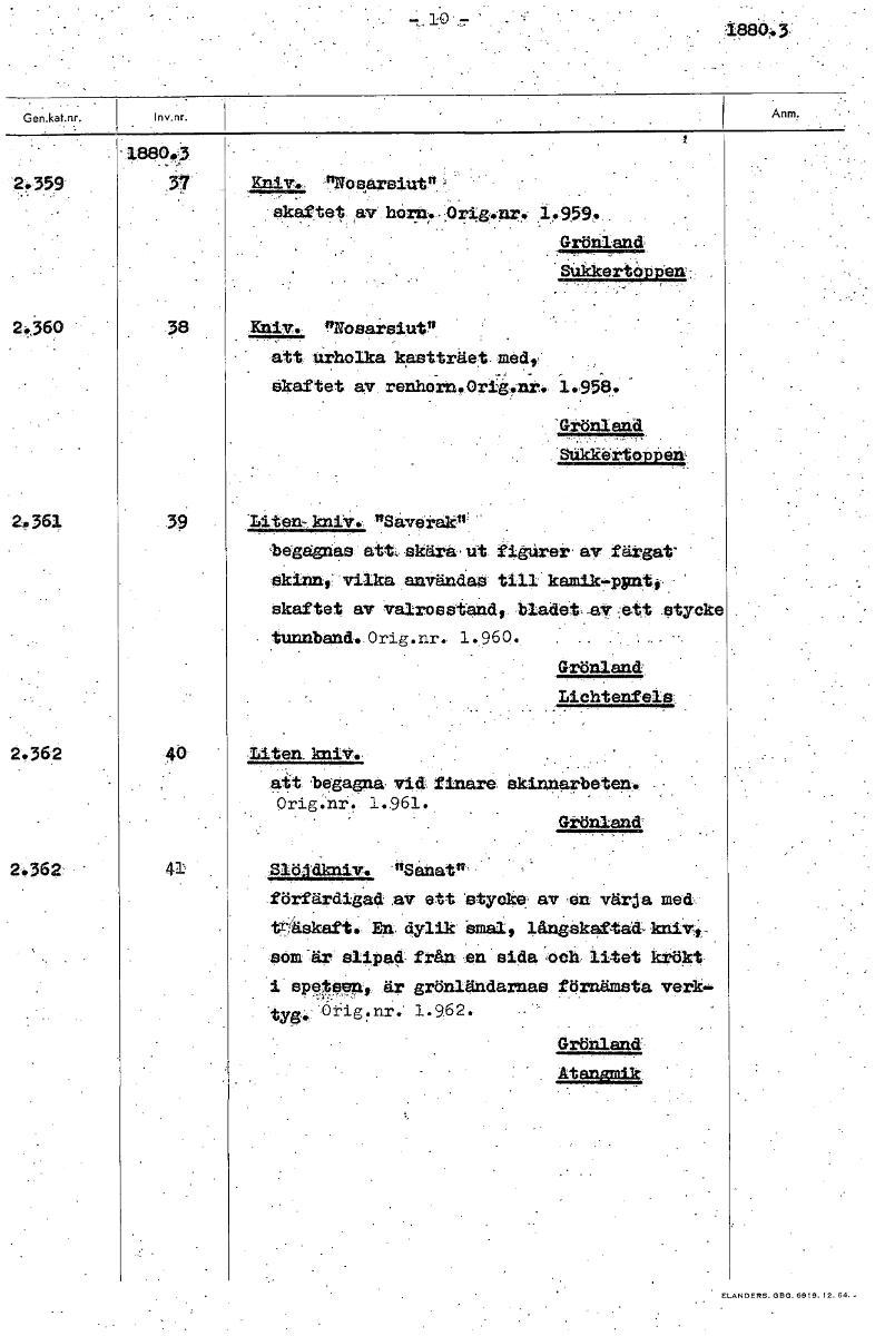 • iptioi. 3: 3,880.5 2.359 Kniv.. "Nosarslutn j skaftet av horn., Orig.nr. 1.959. Grönland • .Siikkertöpnerk: 2.360 38 Kniv. nNosaksiut" att urholka kastträet med', Skaftet av renhorn.Orig.nr. Grönland Stikk- -ertonnere 2.361 39 Liten- kniv. "Saverak" 'begagnas att, skära ut figUrer av färgat' skinn,• vilka användas till kamik-ppnt, ' skaftet av valrosstand, bladet ,av ett stycke • tunnband. Orig.nr. 1.9 6 0 . Grönland Lichtenfels 2.362 40 Liten. kniv. • . att begagna vid finare skinnarbeten. Orig.n. 1.961. Grönland: 2.362 • 41 Siö dknive "Senat" - • förfärdigad av ett stycke, av en värja med träskaft. dylik smal, lång-skaftad kniv-t_ • som -är slipad från en sida och litet krökt • i spetspny är grönländarnas förnämsta verk- • tya. Orig.nr. 1.962. Grönland Atnjni [ocr]