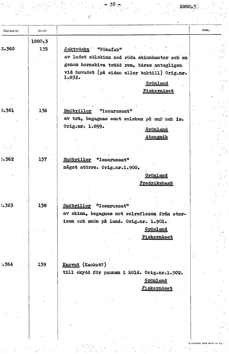 2880;.3::, :1880,3 2.360 135 Jaktväska- nöks/åk" av ludet sälskinn med röda skinnkanter oehen genom hornskiVa trädd rem, bäres antagligen. vid huvudet (på sidan eller baktill) Orig.nr. Grönland Piskernäset 2.361 136 Snöbrillor "Issarussat" av trä, begagnas emot solsken på- 00-och is. Orig.nr,. 1.899. Gadnland, Atangmik !.362 137 Snöbrillor "Isearussat" något större. Orig.nr.1.900. Grönland Predrikahaab !.363 138 Snöbrillor "Issarussat"' av skinn., .begagnas mot solreflexen från stor- isen och snön på land. Orig.nr. 1.901.. Piskernäset !.364 139 Kaovut (Raokut?) till skydd för pannan i köld. Orig.nr.1.902. Grönland' Pi skernäset [ocr]
