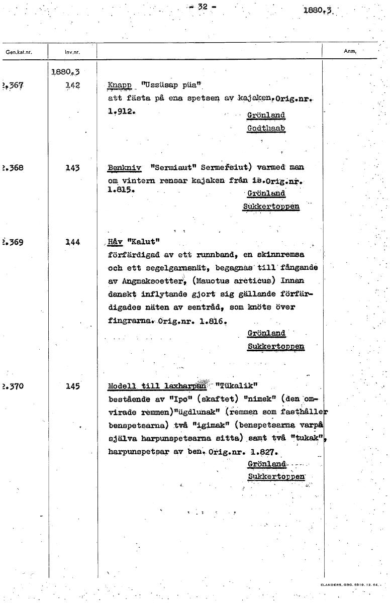 . 32 - leao.3.. 1880o3 ?.367 14? plogg_ "Ussilsap att fästa på ena spetsen ay.kajakenorig.nr,, 1.912. - Grönland Go.dthaab 2.368 143 Benkniv "Sermiaut" Sermefsiut) varmed man om vintern rensar kajaken från in.Orig.nk• 1.815. Grönland Sukkertopcen 2.369 144 Håv "Kalut" förfärdigad av ett runnband, en skinnremaa och ett segelgarnsnät, begagnas till'fångande av Angmaksoettet, (Mauotus arcticus) Innan danskt inflytande gjort sig gällande förfär- digades näten av sentråd, som knöts över fingrarna. Orig.nr. 1.816. Grönland.' - Bukkertoapen 2.370 145 Modell till laxhartiik-"Ttikalik" bestående av "Ipo" (skaftet) "nimek" (den om- virade remmen)flägdlunak" (i.ermien sam fasthålle benspetsarna) två "igimAk" (benspetsarna varpå själva harpunspetearna sitta) samt två "tukak" harpunspetsar av ben..0Tig.nr. 1.827.. Grönland-- gukkertoPpow [ocr]Stäng
