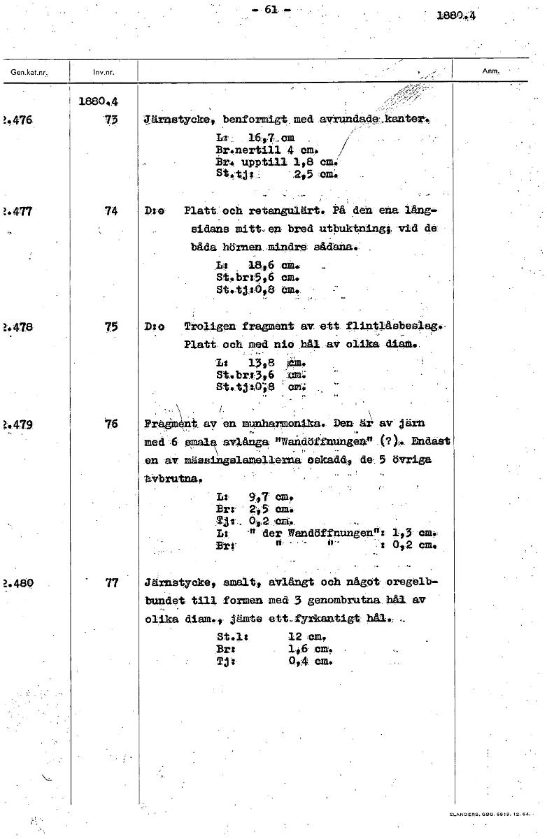 - 61 - • 18804. 1880 4 !•476 73 Järnstycke, benformigt.med avrandds..kanter Ti J 1647.. cm . Br.nertill 4 cm./ Er. upptill 1,8 am.' St;til om*. ?..477' 74 D:o Platt och retangulärt. På den ena lång- sidaös mitt, en bred utbuktning; vid de båda hörnen mindre sådana. . Ia 18,6 cm. St.br:5,6 cm. St.tj:0,8 cm. - , !.478 75 D:o Troligen fragment. av .ett flintlåsbeelag•- Platt. och med nio hål av olika diam. L: 13,8 4A4 St. U4.5, 6 :.01,C.; St.tjt0,8 öm; .4479 76 Fragment. av en munh~a4ka. Den är av järn med-6 smalEk avlånga. "WaiNdöffnungen!' . Endast en av mässingelamellerna oskadd, de. 5 övriga UVbrutna. i - L: 9,7 em. Brr. 2i5 em. TJI.. 454,? L: ." der Wandöffnungenn: 193 em. 092 cm. 2.480 77 Järnåtycke, smalt, avlångt och något oregelb- bundet till forman med .3 genombrutna hål. av olika diam.,- jämte ett_ fyrkantigt St.l: 12 ,cm. Br: 1,8 cm. Tj 4 0,4 am. [ocr]