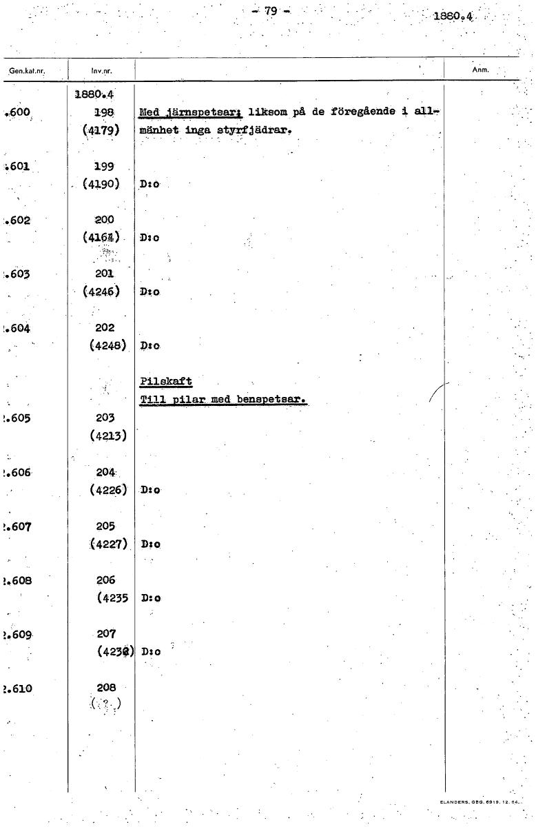 • 79 -; 1880:4 .600, 198 Med järnspetsar; liksom på de föregående (4179) månhet inga styrfjädrar. .601 199' (4190) D:o .602 200 (4164) D:o .603 201 (4246) D.o. !.604 202 (4248) Dlo Pilskaft Till pilar m... Visa hela