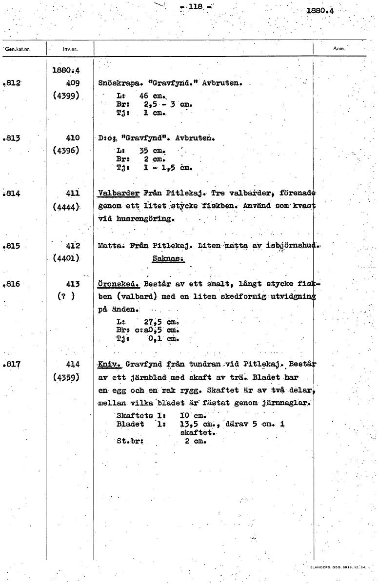 -.118 - 1880.4 1880..4 .812 499 Snöskrapa. Gravfynd." Avbruten. (4399) L= 46 cm., Bra 2,5 - .3 cm. Tj: 1 cm.` .813 410 :Dh2L "Gravfynd". Avbrutmi. (4396) L: 35 cm. Brr 2 cm. Tj a 1 - 1 5 åm. .814 . 41...