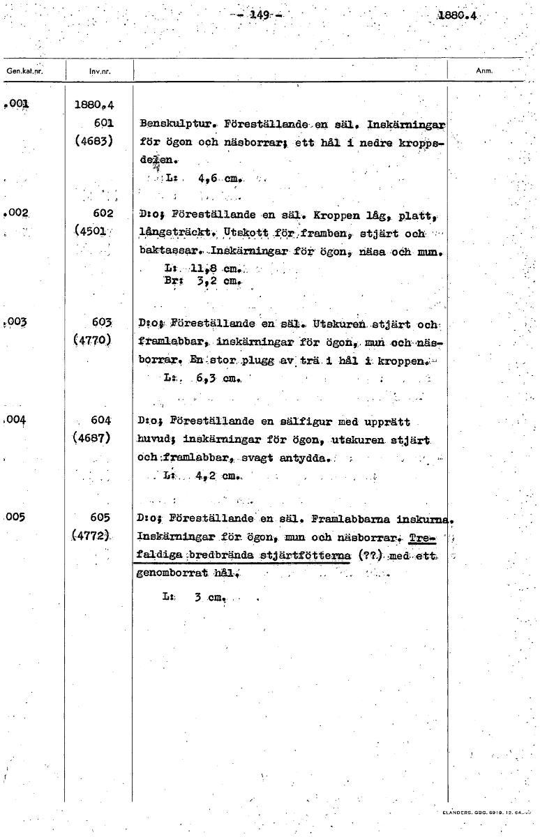 ,1880.4 • 1880 p 4 601 Benskulptur. Föreställande -en säl.. Inskärningar (4683) för ögon och näsborrar; ett hål i nedre kropps- . deien. .!1,4 4,6, cm, .002, 602 D:o; Föreställande en säl. Kroppen låg...
