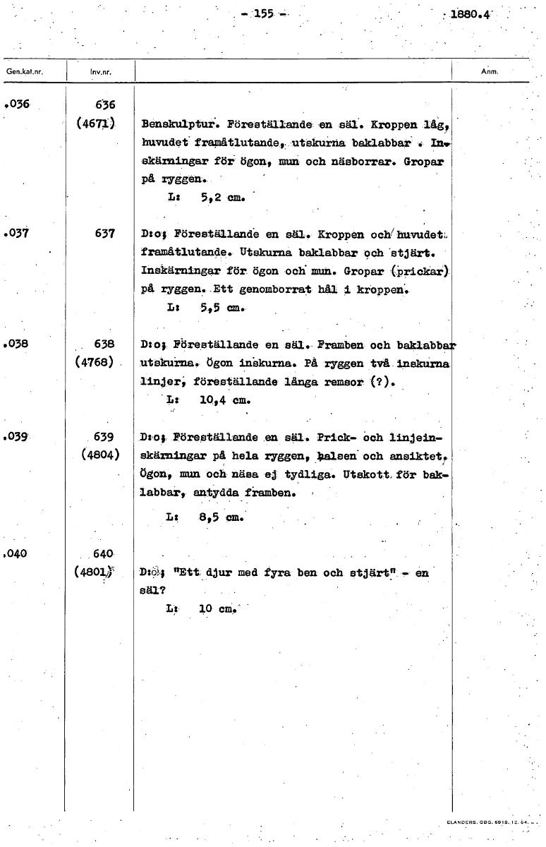 . 155 1880.4. .036 636 (467x). Benskulptur. Föreställande, en säl. Kroppen låg, huvudet framåtlutande, . utskurna baklabbar In. skärningar för ögon, mun och näsborrar. Gropar på ryggen. L: 5,2 cm. .037 637 D:o; Föreställande en säl. Kroppen och/huvudet, framåtlutande. Utskurna baklabbar och stjärt. Inskärningar för ögon och' mun. Gropar (Prickar) på ryggen. Ett genomborrat hål i kroppen. la 5,5 cm. . 08 638 Dso; Phreställande en säl. Framben och baklabb (4768) . utskurna. ögon ini3kurna. På ryggen två insktirna linjer; föreställande långa remsor (?). la 10,4 cm. . 039 639 Da-ofr Föreställande en säl. Prick- Och linjein- (4804) skärningar på hela ryggen, Italsen. och ansiktet. ögon, mun och näsa ej. tydliga. Utskott för bak- labbar, antydda framben. la 8,5 cm. »040 640 (4801,)' DO.; "Ett, djur med fyra ben och stjärt" - en säl? Ii: 10 cm." [ocr]