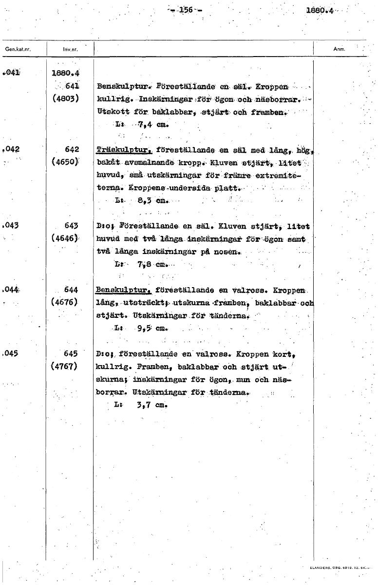 i 1880.4- 1880.4 641 Benakulpturs Föreställande en säls Kroppen, (4803) kullrig. Inskärningar -för ögon 'och näsborrar. - '- Utskott för: baklabbar, .stjärt- och framben.; , L:. 7,4 cm. .042 • 642 Trä...