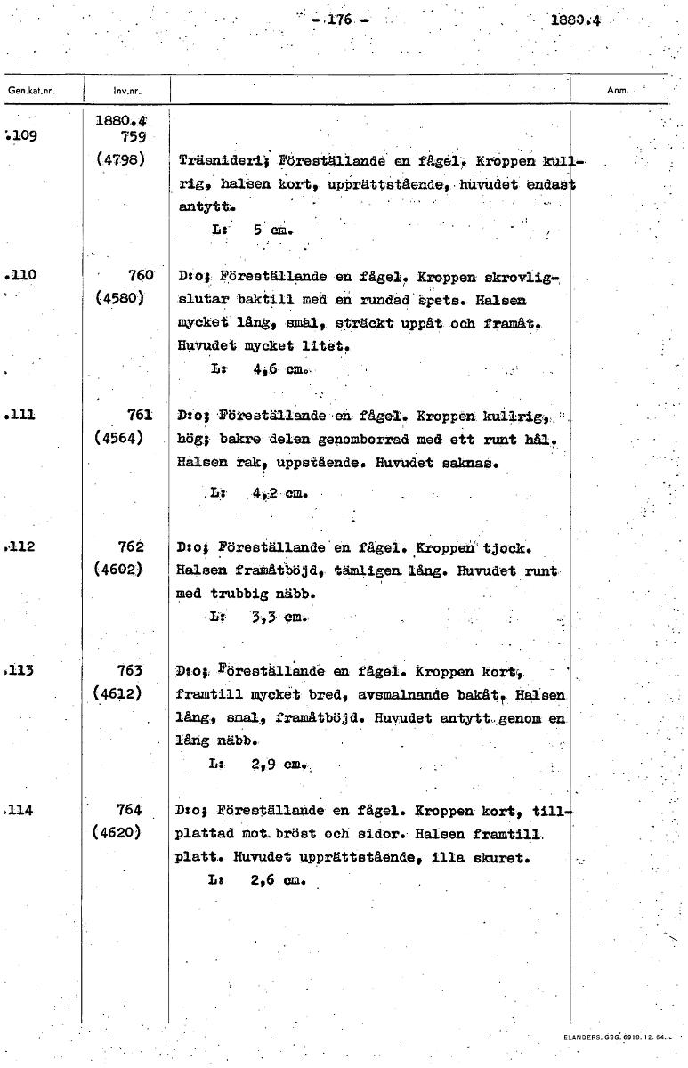 •••• -,176 - 1880.4 1880.4 :109 759 (.4798) Träeniderii Föreställande' en fågel'. Kr4peh ki41 rig, halten, lertt. uArättetåendeS.hUvudet endaa antytt. La- 5 cm. .110 760 D:ok Föreställande en fågel. K...