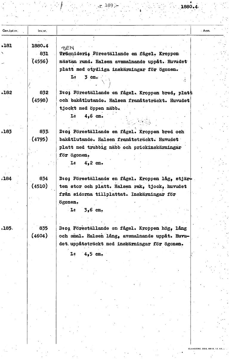• - 189 • 18804, .181 1880.4 ISEN 831 Tr4g4iderif Föreställande ea fågeI. Kroppen,. (4556) nädtån rund. Halsen avsmalnande uppåt, Huvudet. platt med otydliga inSkärningar för Ögonen. Li 1 öm.; • , .182 ... Visa hela