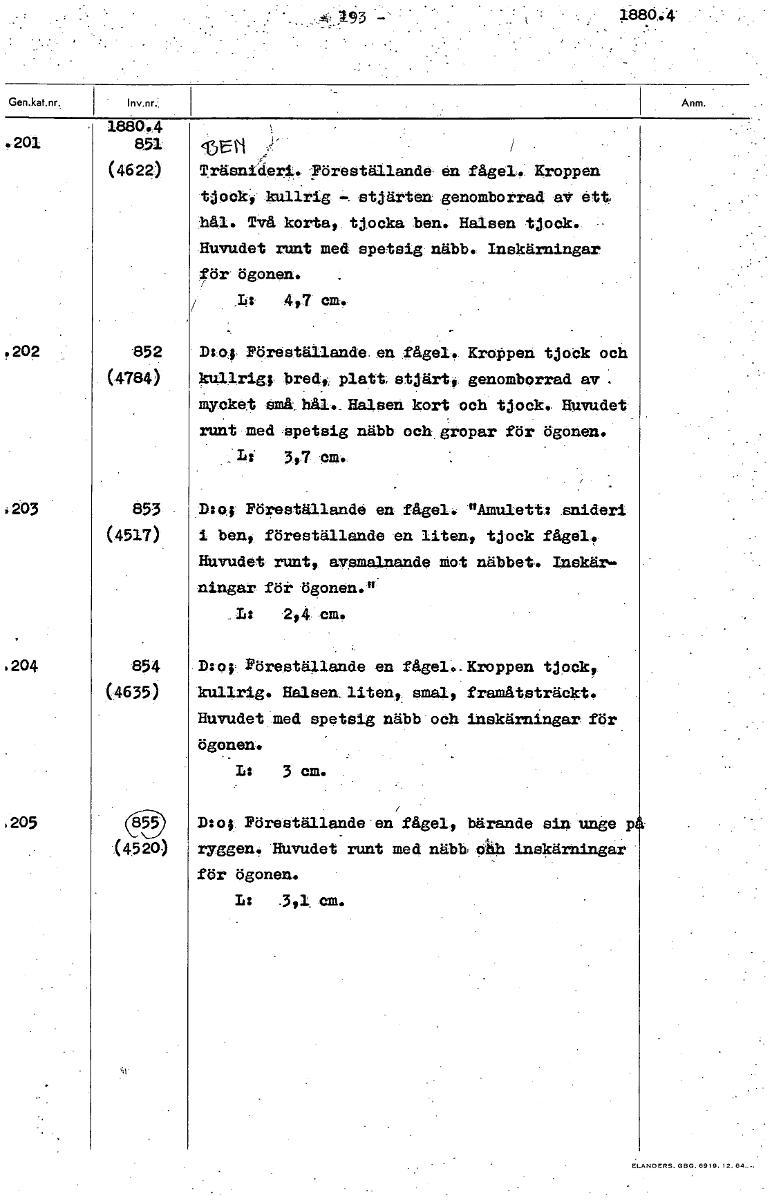 • 1.880.4 1880.4 .201 851 i / (4622) Träsnideri.. -Föreställande. ån 'fågel..I Kroppen tjock,* kullrig stjärten: genomborrad aV ett hål. Två korta, tjocka ben. Halsen tjock. - Huvudet runt med spetsig n... Visa hela