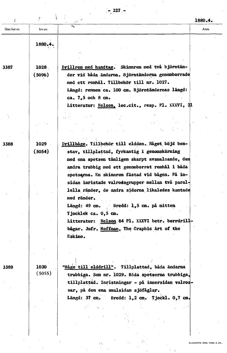 0227- 1880S4 1880.4. 3387 1028 Drillrem med handtag. Skinnrem med två björntån- (5096) der vld båda ändarna. Björntänderna genomborrad med ett remhål. Tillbehör till nr. 1027. Längd: remmen ca. 100 cm. Björntändernas längd: ca. 7,5 och 8 cm. Litteratur: Nelson. loc.cit., resp. Pl. XXXVI, 3388 1029 Drillbåge. Tillbehör till elddon. Något böjd ben- (5054) stav, tillplattad, fyrkantig i genomskärning med ena spetsen tämligen skarpt avsmalnande, d andra trubbig med ett genomborrat remhål i båda spetstirna. En skinnrem fästad vid bågen. På in- sidan inristade valrodsgrupper mellan två paral lella ränder, de andra sidorna likaledes kantad med ränder. Längd: 49 em. Bredd: 1,5 am. på mitten Tjocklek ca. 0,5 Litteratur: Nelson 84 Pl. XXXVI betr. borrdr bågar. Jmfr. Hoffman, The Graphic Art of the Eskimo. 3389 1030 "Båe till elddrill". Tillplattad, båda ändarna (5055) trubbiga. Som nr. 1029. Båda spetsarna trubbiga Inristningar - på innersidan valro sar, på den ena amalsidan sjöfåglar. Längd: 37 cm. Bredd: 1,2 am. TjoCkl. 0 7 am [ocr]