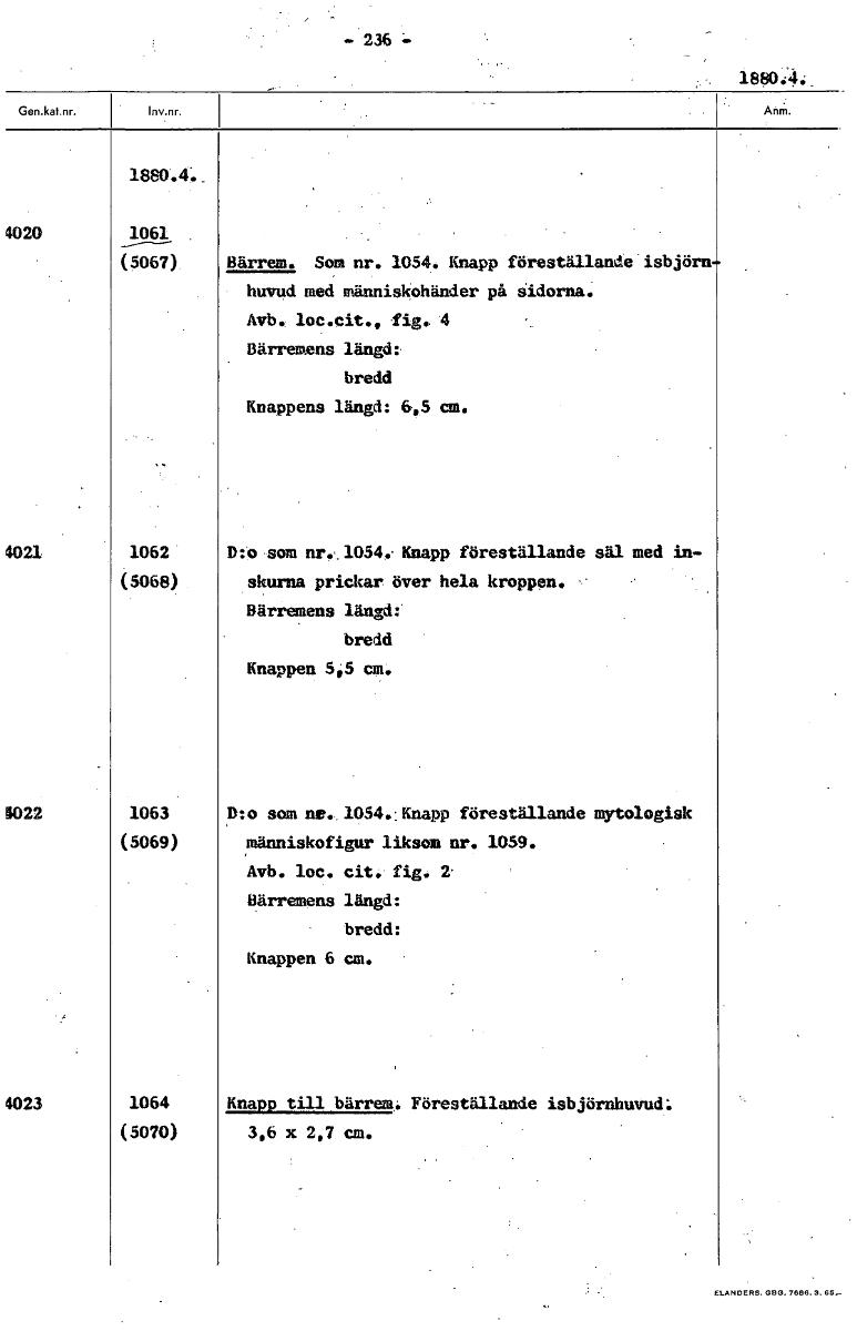 1880:44_ 1880.4._ 4020 1061. (5067) Bärrem. Som nr. 1054. Knapp föreställande isbjörn huvud med människohänder på sidorna. Avb. loc.cit., fig.. 4 Bärremens längd: bredd Knappens längd: 6,5 cm. 4021 1062 D:o som nr. 1054.• Knapp föreställande säl med in- (5068) skurna prickar över hela kroppen. Bärremens längd: bredd Knappen 5,5 cm. 4022 1063 D:o som ne. 1054. Knapp föreställande mytologisk (5069) människofigur liksom nr. 1059. Avb. loc. cit. fig. 2 Bärremens längd: bredd: Knappen 6 cm. 4023 1064 Knapp till bärrem. Föreställande isbjörnhuvud: (5070) 3,6 x 2,7 cm. [ocr]Stäng