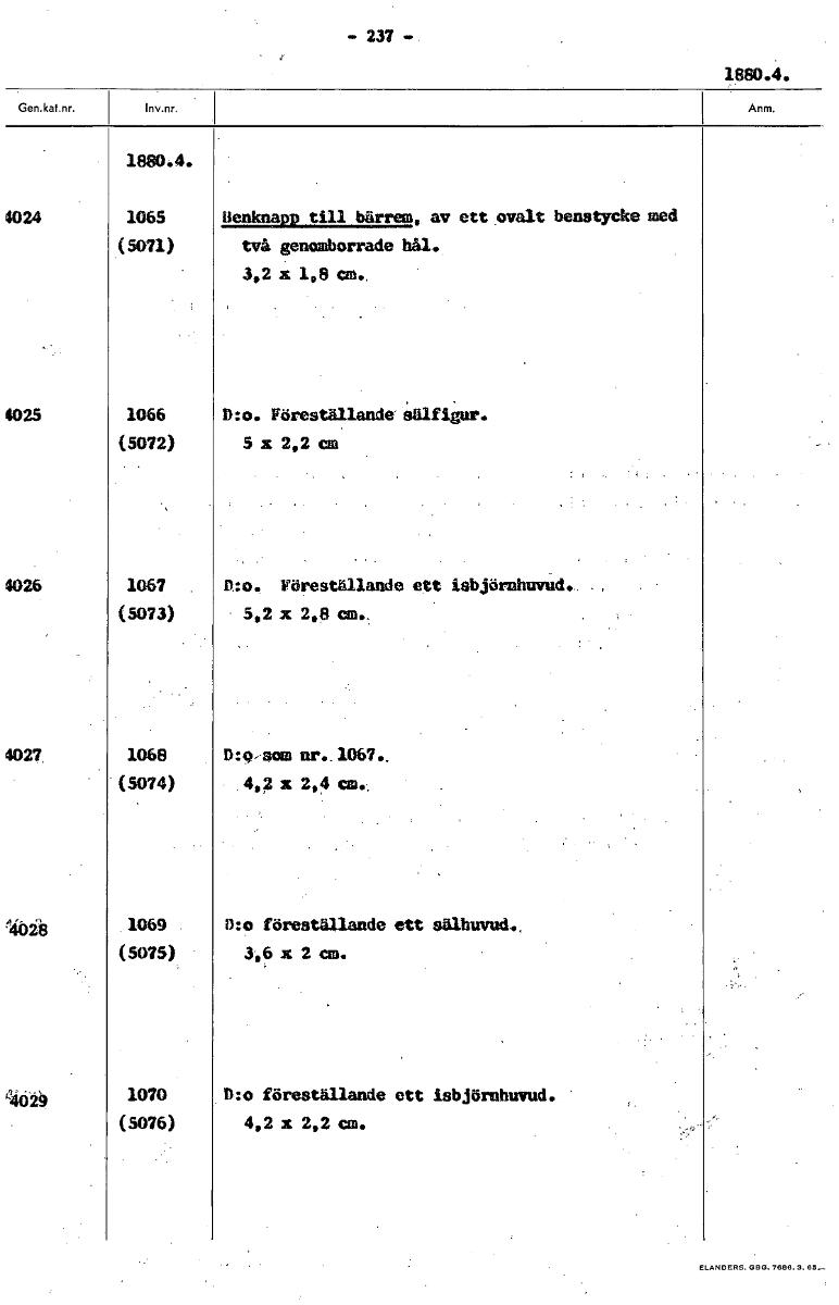 -237- 1880.4. 1880.4. 4024 1065 Benknaff till bärrem, av ett ovalt benstyeke med .0011) två genomborrade hål.. 3,2 x 1,8 cm.. 4025 1066 D:o. Föreställande sälfigur. (5072) 5 x 2,2 em 4026 1067 D:o. Fö...
