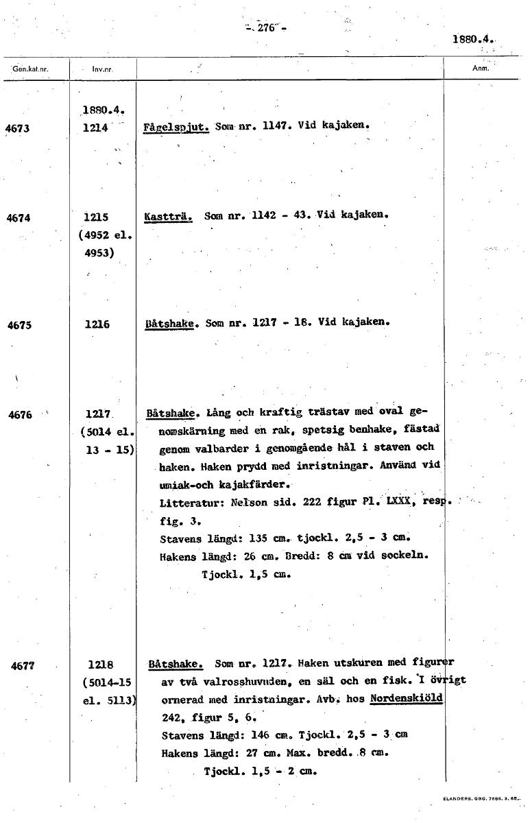 -276- T 1880.4. 1880.4. 4673 1214 Fii.gelin't_auL. Som nr. 1147. Vid kajaken. 4674 1215 Kastträ. Som nr. 1142 - 43. Vid kajaken. (4952 el. 4953) 4675 1216 Båtshake. Som nr. 1217 - 18. Vid kajaken. 467...