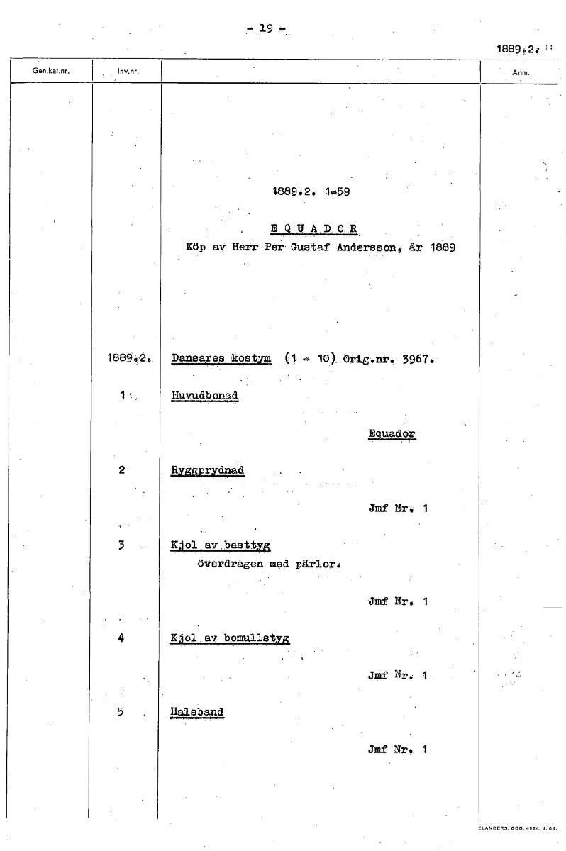 • 19 1889.2: 1889.2. RQUADOR Köp av Herr Per Gustaf Andersson, år 1889 1889, 2., Dansares kostym 10). Orig.nr. 3967. Huvualumo.d. Equador 2 Ryggprydnad *Ib! Nr. 1 3 Kjol av,basttyg överdragen med pärlor... Visa hela