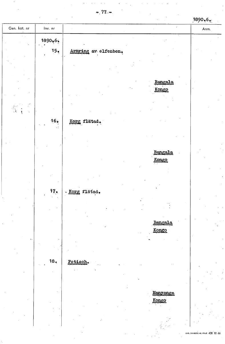 • 77. - 18904,6, 15, Araring, av. elfenben, BaTiala Kongo 16, 15.24 flätad. Bangala ,Kongo 17. e, flätad. gala Kongo, 18, Fetisch. • Markyanga Kongo [ocr]