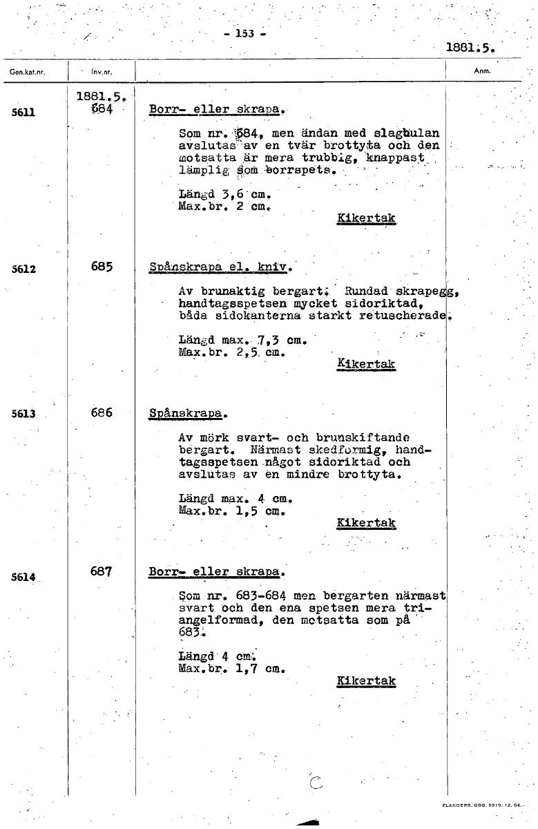 - 153 - 1881.5. 1881.5. 5611 084 Borr- eller skrapa. Som nr. 4, men ändan med slagbulan aVslutasav en tvär brottyta Och den motsatta är mera trubbig, knappast: lämplig Oom.borrspett. Längd 3„6-cm, Max.br. 2 cm, Kikertak 5612 685 Spånskrapa el. kniv. Av brunaktig bergart; Rundad skrape.2g, handtagsspetsen mycket sidoriktad, båda sidokanterna starkt retuscherad. Längd max. 7,3 cm. Max.br. 2,5em. Kikertak 5613 686 Spånskrapa. Av mörk svart- och brunskiftande bergart. Närmast skedformig, hand- tagsspetsenxågot sidoriktad och avslutas av en mindre brottyta. Längd max. 4 cm. Max.br. 1,5 cm. Kikertak 5614 687 Borr- eller skrapa. Som nr. 683-684 men bergarten närmast svart och den ena spetsen mera tri, angelformad, den motsatta som på 683. Längd 4 cur. Max.br. 1,7 cm. Kikertak C [ocr]