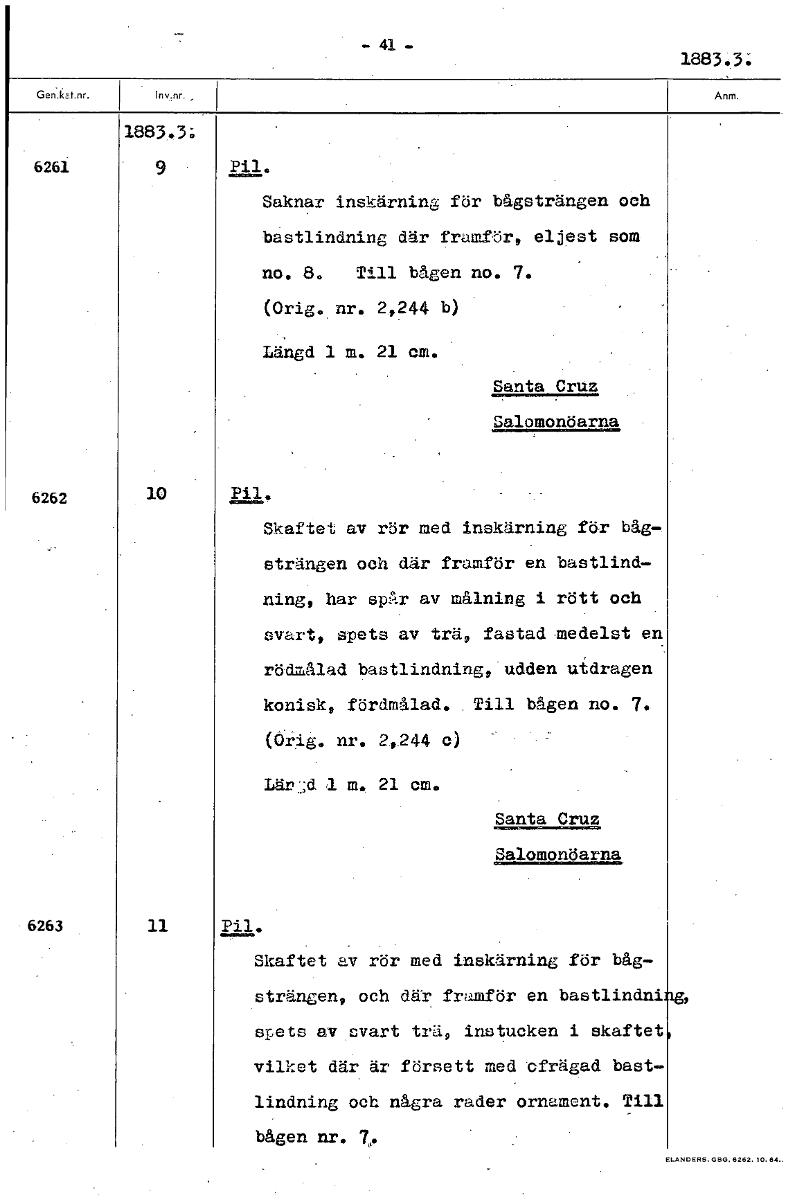 - 41 - 1883.3; 1883..3; 6261 9 Pil. Saknar inskärning för bågsträngen och bastlindning där framför, eljest som no. 8. Till bågen no. 7. (Orig. nr. 2,244 b) Längd 1 m. 21 cm. Santa Cruz Salomonöarna 62...