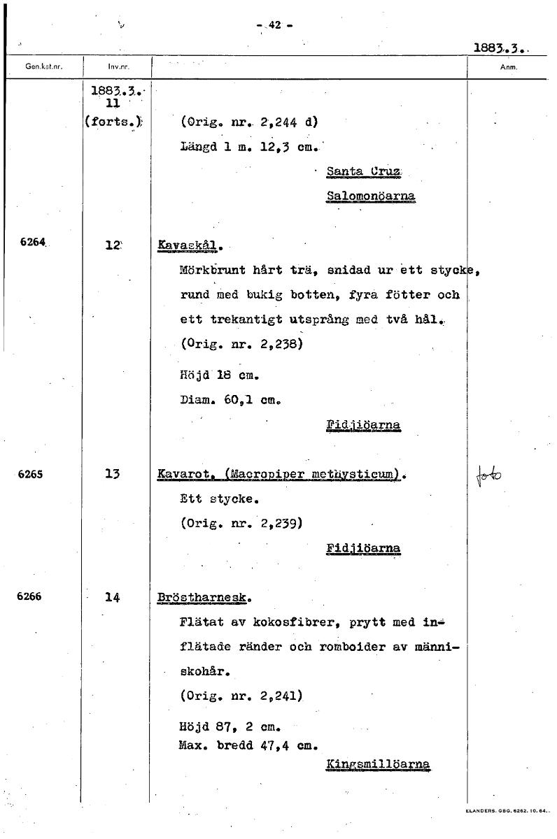 -..42 - 1883.3..- 11 (forts.); • (Orig. nr.. 2,244 d) Längd 1 m. 12,3 cm..' • Santa CrUz Salomonöarna 6264. 12: Kavaskål. Mörkbrunt hårt trä, snidad ur ett styc rund med bukig botten, fyra fötter och ett trekantigt utsprång med två hål. (Orig. nr. 2,238) Höjd 18 cm. Diam. 60,1 cm. Fidjiöarna 6265 13 Kavarot. (Macropiper mothysticum Ett stycke. (Orig. nr. 2,239) Maar_ria 6266 14 Bröstharnesk. Flätat av kokosfibrer, prytt med in- flätade ränder och romboider av männi- skohår. (Orig. nr. 2,241). Höjd 87, 2 cm. Max. bredd. 47,4 cm. Kingsmillöarna [ocr]