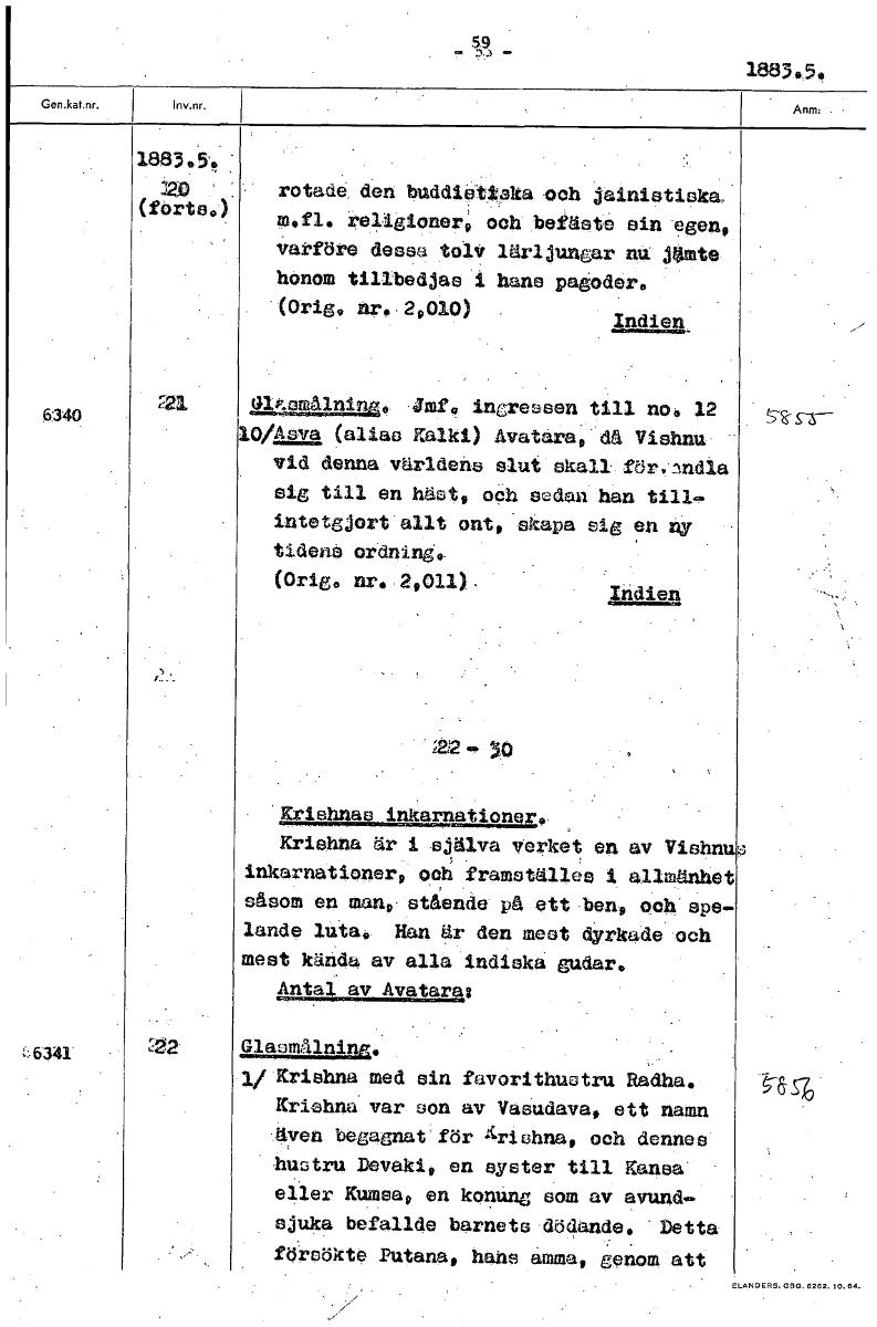 53 1883.5. 1863.5e rotade den buddiettaka och jainistiska, (forts.) m.fl. religioner, och befäste sin egen, varför° dessa tolv lärljungar nu j4mte honom tillbedjas 1 hane pagoder, (Orig, nr. 2,010) Indien 223, jmr. ingressen till no, 12 5--k 5-å- 6340 10/Asva (alias Kalk1) Avatara; då Vishnu - vid denna världens slut skall för,3ndla sig till en häst, och seden han till. intetgjort allt ont, skapa sig en ny tidenå ordning., (Orig, nr. 2,011), Indien 30 Kriehnae inkarnationer, Krishna är i själva verket en av Viehnu s inkarnationer, och framställes 1 allmänhet såsom en man, stående på ett ben, och spe. landa luta, Han är den mest Ayrkade och mest kända av alla indiska gudar. Anta)r av Avatarag 01asmålninn. Krishna med ein favorithustru Radha. Krishna var son av Vasudava, ett namn även begagnat för 4rishna, och dennes hustru Devaki, en syster till Kansa eller Kumea, en konung som av avund. sjuka befallde barnets dödande. Detta försökte Putana, hans amma, genom att [ocr]