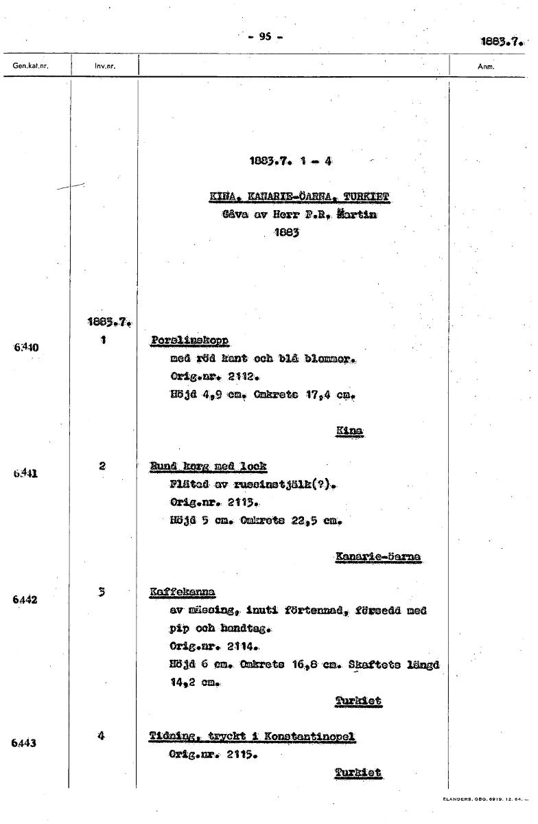 - 95 - 1883.7., 1883.7. 1 KIRA, KARAEIS-0ARNA,, TURKIET Gåva av Herr P.R. *artist 1863 1 Zatellmerroct 6:440 ned räd kant och blå blommors Orig•nr. 2112. Röjd 449 olat Ockrets 1704 cp. b431 2 Rund korg med lock flfle vruacinetjä.lik(?). ~ear. 2113., Röjd an. ~te 2245 cm. Kapaie-5arna, 3 Kaffek~ 6442 av oing, inuti fkirtennad4 Mopeda ned pip och ~tag. Orig.nr., 2114., Röjd 6 ca. Omkrets 16,8 cm. Skaftet° längd 1442 cm» Turkiet 4 T1,./~42zokt 6443 Ortg.nr. 2115. Turkiet. [ocr]