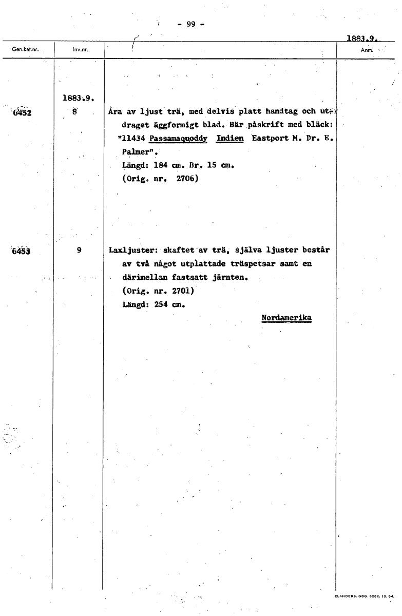 • -99- 1883.90. 1883.9. . 3-- 6452 8 Åra av ljust trä, med delvis platt handtag och utr) draget äggformigt blad. Bär påskrift med bläck: "11434 Passamacmoddy Indien Eastport M. Dr. E. Palmer". Längd: 18... Visa hela