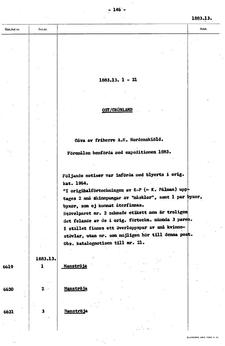 - 146 - 1883.13... 1883.13. 1 - 21 OST/CRONLAND Gåva av friherre A.E. Nordenskiöld. Föremålen hemförda med expeditionen 1883. Följande notiser var införda med blyerts i orig. kat. 1964. "I origihalförteckningen av K-P (.= K. Pålman) upp tages 2 små ökimplutgax av "måsklor", samt 1 par yxor, byxor, sma ej kunnat återfinnas. Stövelparet nr. 2 saknade etikett men är trolige det felande av de 1 orig. föttecka. nämnda 3 1 stället finnes ett överloppspar av små kvinno- stövlar, utan nr. som möjligen hör till denna po Obs. katalognotisen till nr. 21. 1683.13. 6619 1 Manströja, 6620 2 Manströja 6621 3 Manströja [ocr]Stäng