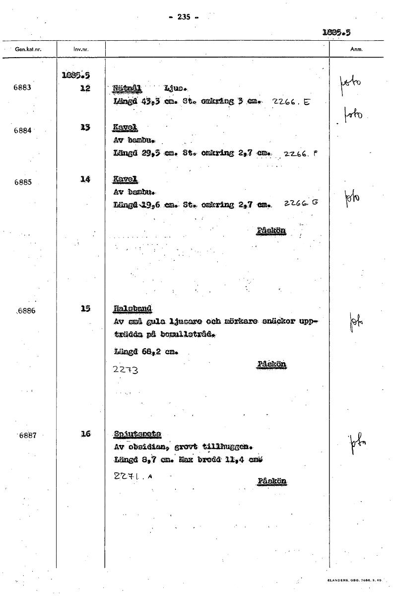 - 235 - 1,233,5 6883 12 Varig 450 3 2_2_GG 6884 13 15021 Av bambu* Ztkiad 29,5 CC. St. omkring 297 0/32*, 2_7__64. 6885 14 mal Av boratfu• Tgängd496 tak. OU cokrkag 297 eak, 2-26G. G Maken ,6886 15 Halsband Av mil gula ljusare och al3~2 snäckor upp- trädda pa bouglotrA4 Längd. 66,2 cm. 3 6887 16 SiVutsosts Av Obsidian; grovt. ,411kuggen. \ÄN Längd at:7 em; mani brodd' 11,4 .cm Påskön [ocr]