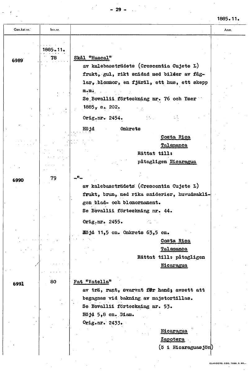 - 29 - 1885. 11. 1885.11. 6989 78 Skål HuacaIn av kalebassträdets (Crescentia Cujete i) frukt,,gul, rikt snidad med bilder av fåg- lart-blomMort en fjäril, ett hus, ett skepp . Se,povallii förteckni n...