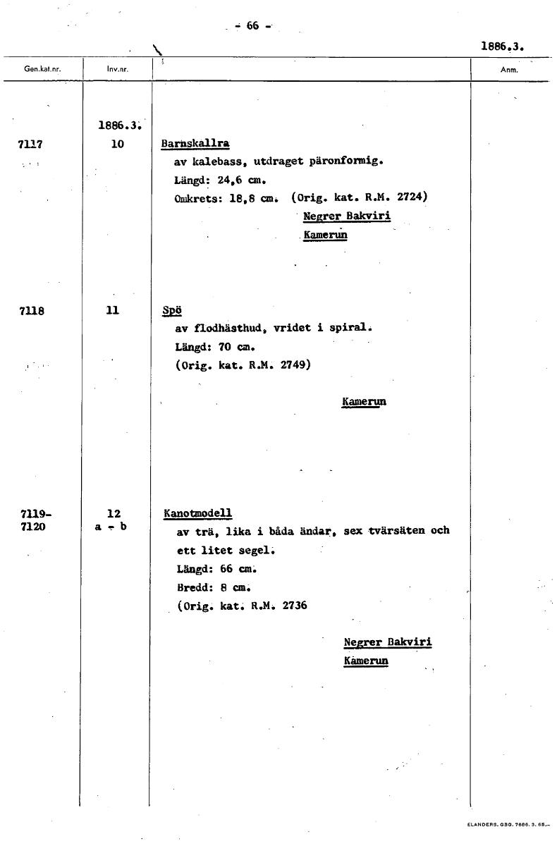 • 66 - 1886.3. 1886.3. 711? 10 Barnskallra av kalebass, utdraget päronformig. Längd: 24,6 am. Omkrets: 18,8 cm. (Orig. kat. R.M. 2724) Negrer Bakviri Kamerun 7118 11 Spö av flodhästhud, vridet i spiral.... Visa hela
