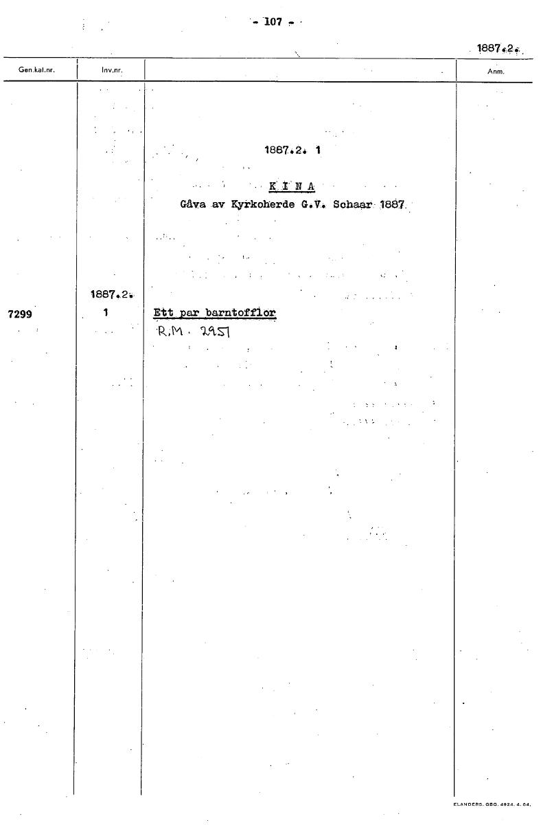 • - 107 - 188746.2 1887.2. 1 • • K' 1'. N A Gåva av Kyrkoherde G.V. Schaar. 1887. 1887•2.. 7299 1 Ett par barntofflor P, ,M Ick,s1 [ocr]