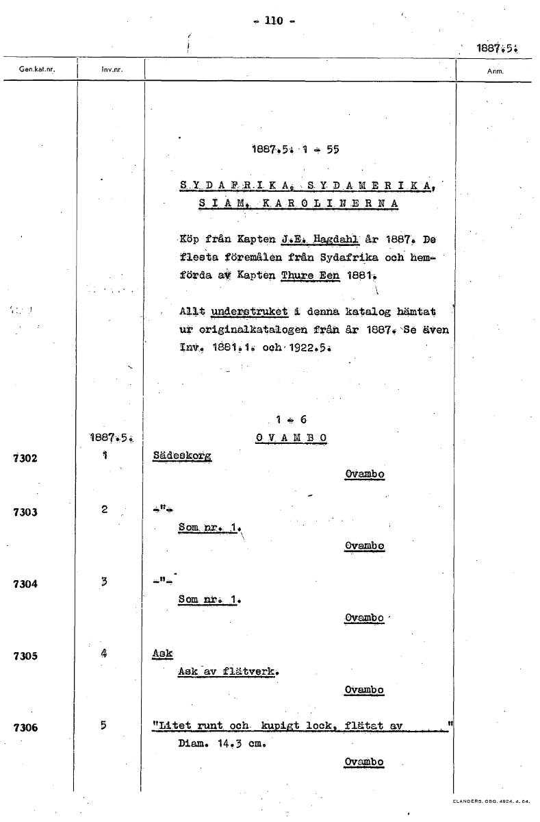 110 18879 ; 1887.5; 1 55 S,Y.DAYII-IKA4.SYDAMBRIKA.• SIAM, KAROLINERNA KÖP från Kapten JAB....Bagdahl år 1887. De flesta föremålen från Sydafrika och hem.- förda aV Kapten Thure Ben 1881. Allt understruket i denna katalog hämtat I ur originalkatalogen från år 18879 'Se även InV. 1881.1. och 1922.5. 1 — 6 1887;5; OVAMBO 7302 1 Sädeskorg Ovamb 7303 2 Som. nr. - \ Ovambo 7304 3 Som nr. Ovambo 7305 4 fink Ask av flätverk. Ovambo 7306 5 "Litet runt och- kupigt lock flätat av Diam. 14.3 em. Ovanbo [ocr]Stäng