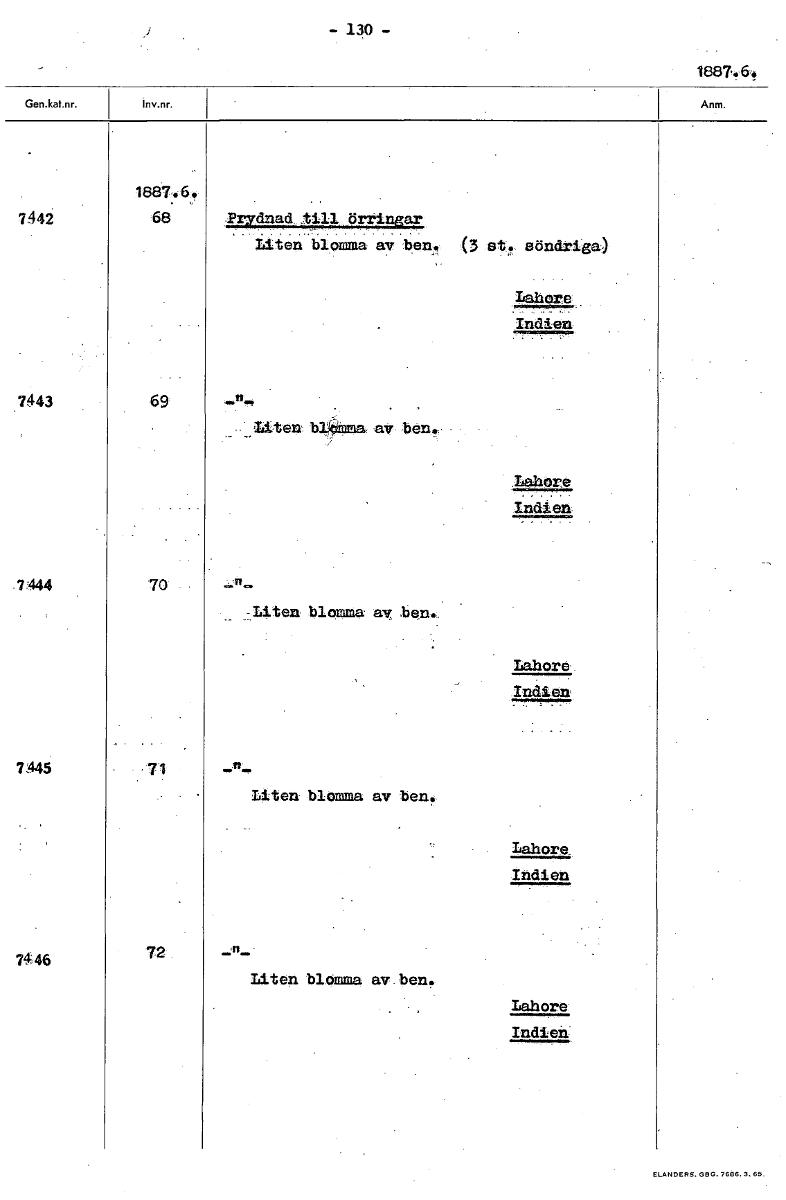 • - 130 - 1887.6t 1887..6. 7442 68 Prydnad till örtinsar Iiiten. blomma av ben. (3 et. söndriga) Labore Indien 7443 69 Liten b1Mma. av ben. Labore Indien .7.444 70 -Liten blomma av ben. Lahore Indi en 7... Visa hela