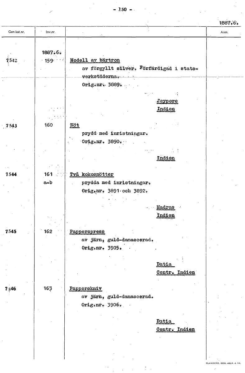 -150- 1.68T,16`a 1867g.4 542 ' 159.: Modell av .bärtron av förgyllt silveX•9 Förfärdigad i stats-, Verketäderna.- jeyosre Indien 7543 160 Nöt prydd. med 4.nristnipear. 00,T04'0 3890.4:. Indian 7544 161 Två kokosnötter a-4) prydda med inristningar;. Orig.nr0 3891= Och 3892. Madras Indien 7545 162 Papperspress av järn* guld-damascerad. Orighnr* 3905 Datia 0entr*, Indian: 7546 163 PannerekniV av järn, guld-damascerad Qrigön#., 5906h, Datia Oentr.. Indien [ocr]