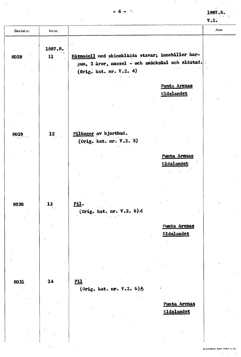 • 1887.8. V .2. 1887.8. 8028 11 Båtmodell med skinnklädda stavar; innehåller har- pun. 2 åror. mussel - och snäckskal och eldstad. (Origj kat. nr. V.2. 4) Punta Arenas Eldsiandet 8020 , 12, Pilkoner av ... Visa hela