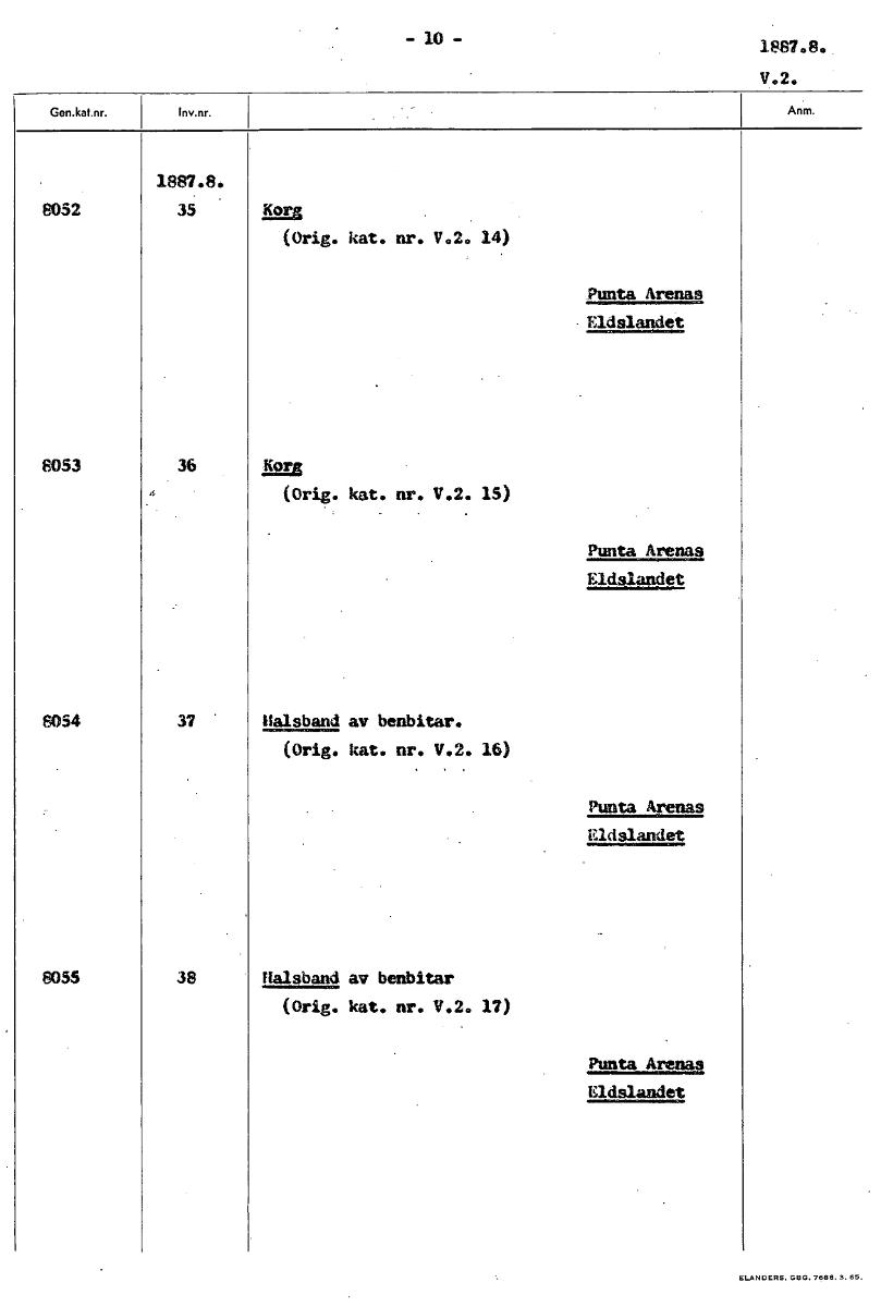 • - 10 - 1887.8. V.2. 1887.8. 8052 35 MES (Orig. kat. nr. V.2. 14) Punta Arenas Eldslandet 8053 36 (Orig. kat. nr. V.2. 15) Punta Arenas Eldslandet 8054 37 Halsband av benbitar. (Orig. kat. nr. V.2. 16)... Visa hela
