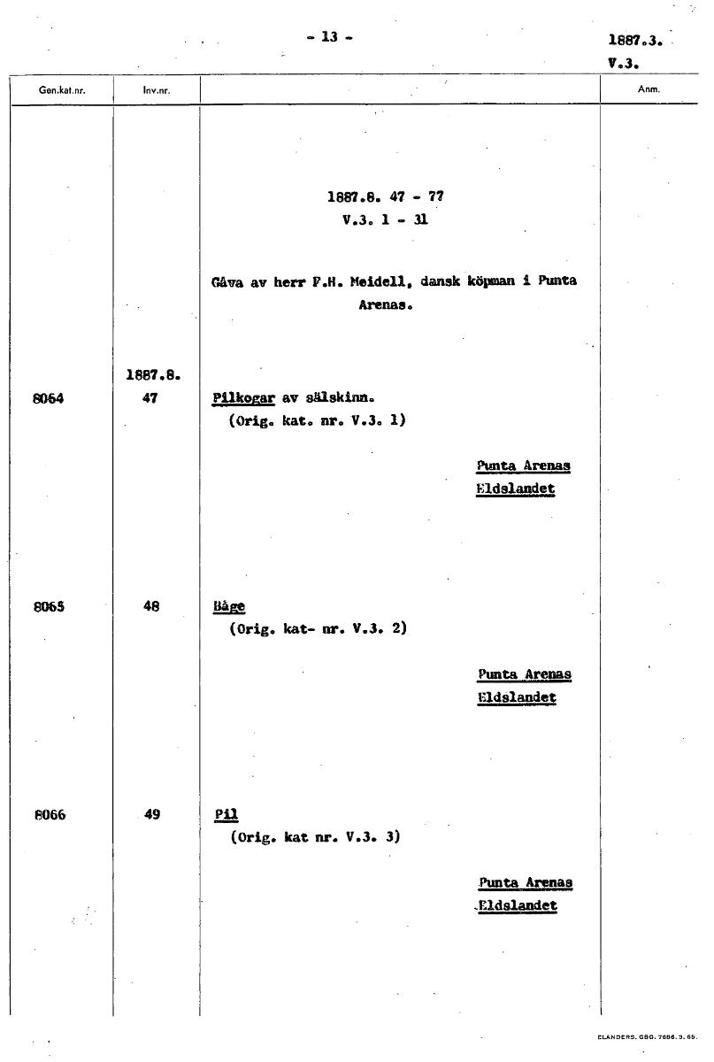 • -13- 1887.3. V.3. 1887.8. 4? - 77 V.3. 1 - 31 Gåva av herr F.N. Meidell, dansk köpman i Punta Arenas. 1887.8. 47 Pilko ar av sälskinn. (Orig. kat. nr. V.3. 1) Punta Arenas fldslandet 8065 48 HAE (Orig... Visa hela