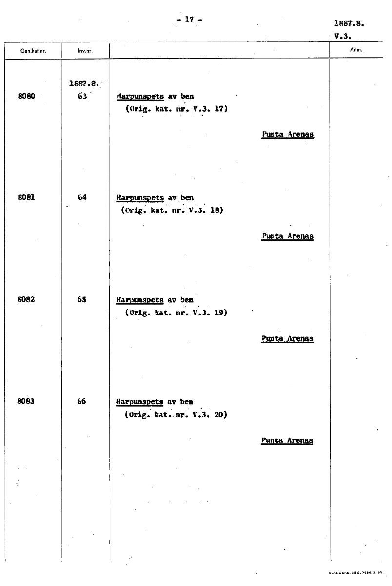 • -17- 1887.8. V.3. 1887.8. 8080 63 Harpunspets av ben (Orig. kat. nr. V.3. 17) Punta Arenas 8081 64 Harpunspets av ben (Orig. kat. nr. V.3. 18) Punta Arenas 8082 65 Harpunspets av ben (Orig. kat. nr. V... Visa hela