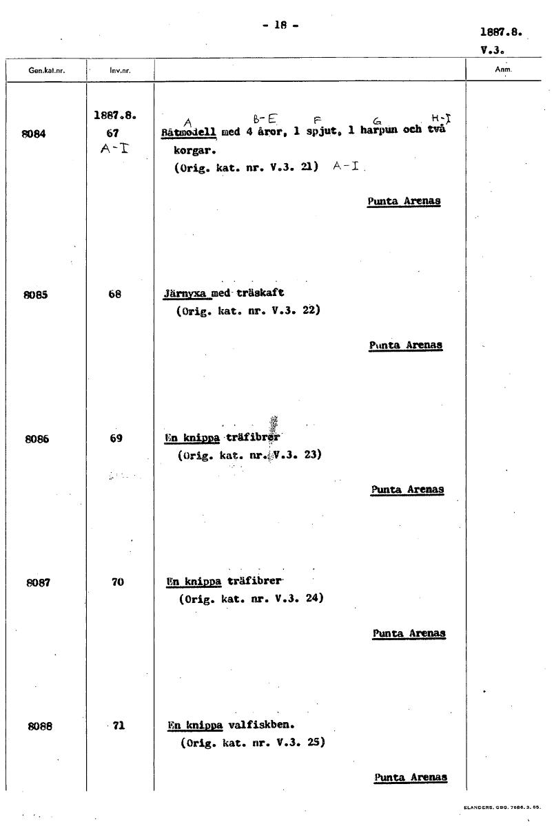 -1.8- 1887.8. V.3. 1887.8. A B-E . m-y 8084 67 Båtmodell med 4 åror, 1 spjut. 1 harpun och två korgar. (Orig. kat. nr. V.3. 21) A-I. Punta Arenas 8085 68 Järnyxa med- träskaft (Orig. kat. nr. V.3. 22...