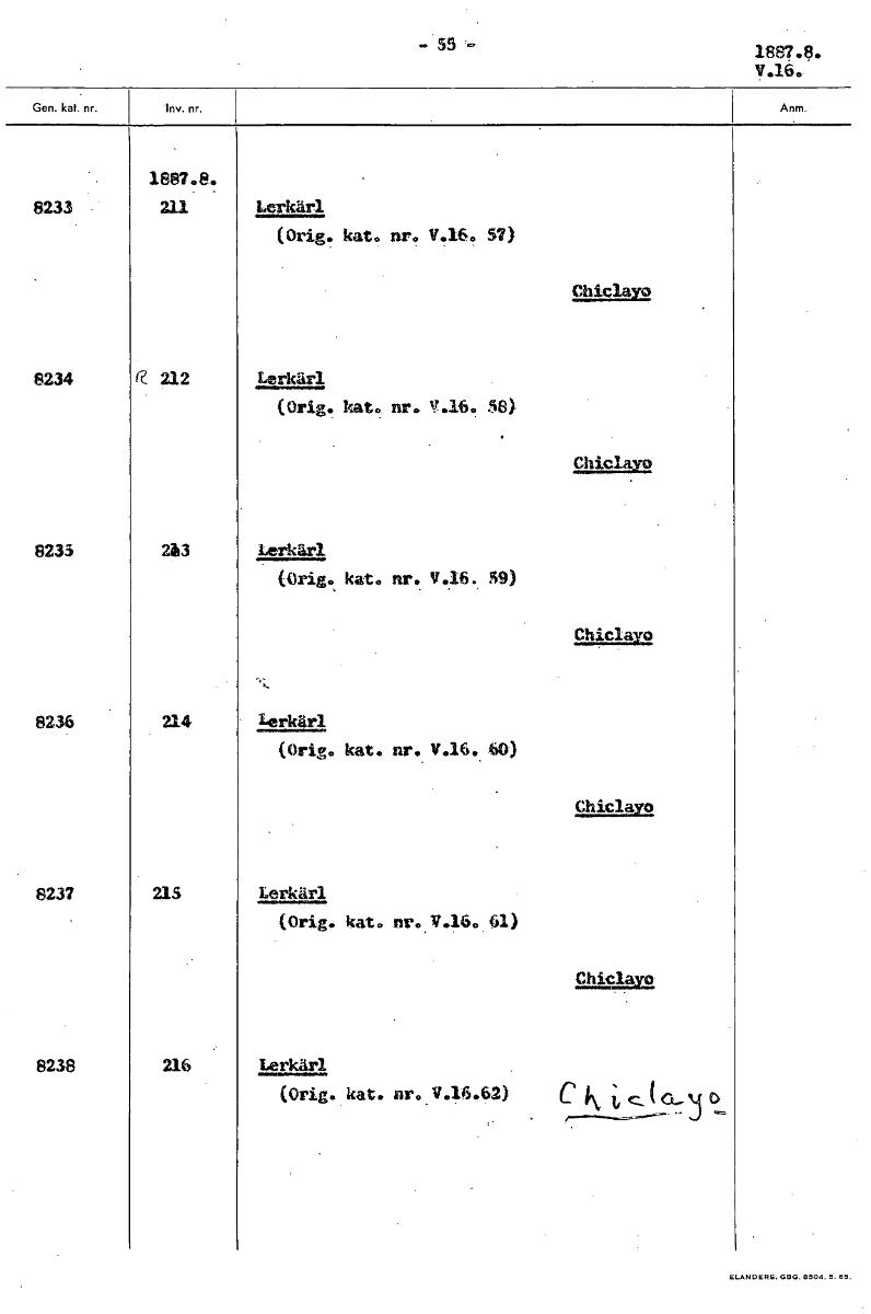 • 55-- 1887.8. V.16. 1887.8. 8233 211' Lerkärl (Orig. kat. nr. V.16. 57) Chiclayo 8234 2 212 Lerkärl (Orig. kat. nr. V.160 58) Chiclayo 8235 23 Lerkärl (Orig. kat. nr. V.16. 59) Chiclayo 8236 214 Lerkär... Visa hela