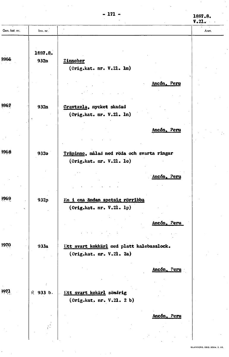 • - 171 - 1887.6. V.21. 1887.8. 9966 932m Zinnober (Orig.kat. nr. V.21. lm) Anc6n.....2gru 396• 932n Gravtavla„ mycket skadad (Orig.kat. nr. V.21. 1n) Ancdn. Peru 3960 932o Träpinne, målad med röda och ... Visa hela