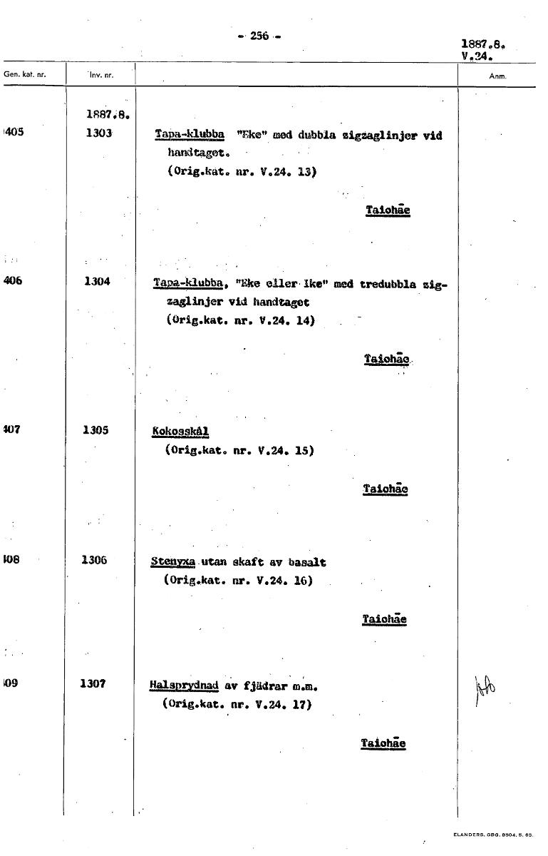 • - 256 ,- 1887.8e V.24, 1887:8. 405 1303. Tapa-klubba "Eke" med dubbla zigzaglinjer vid handtaget. (Orig.kat. nr. V.24. 13) Taloge 406 1304 Tapa-klubbai "Eke eilerike" med tredubbla zig- zaglinjer vid ... Visa hela