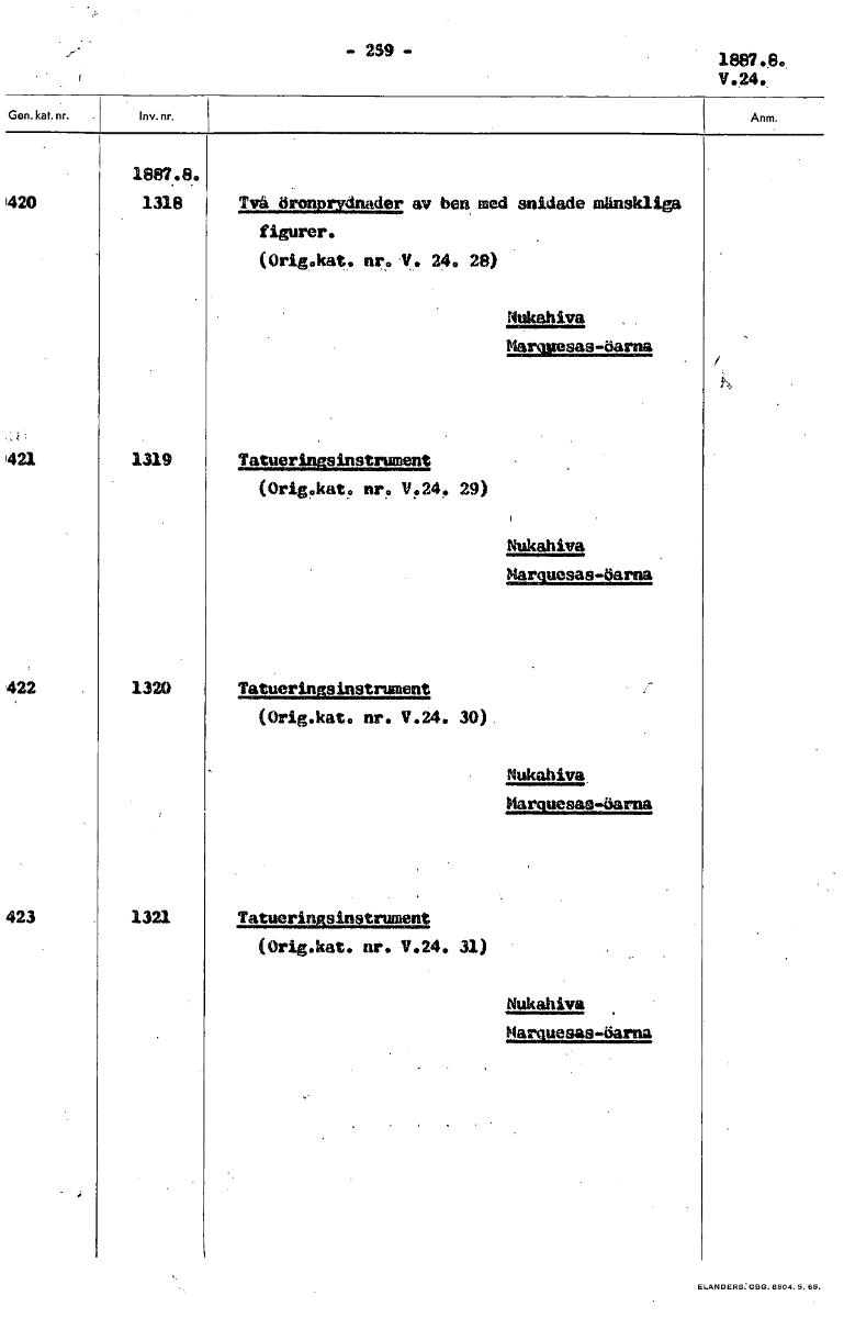 • -259- 1887.8. V.24. 1887.8. 420 1318 Två öronprydnader av hen med snidade mänskliga figurer. (Orig.kat. nr. if. 24, 28) Mukahiva Naruiesas-öarna 421 1319 Tatueringsinstrument (Orig,kat. nr. V.24. 29) ... Visa hela
