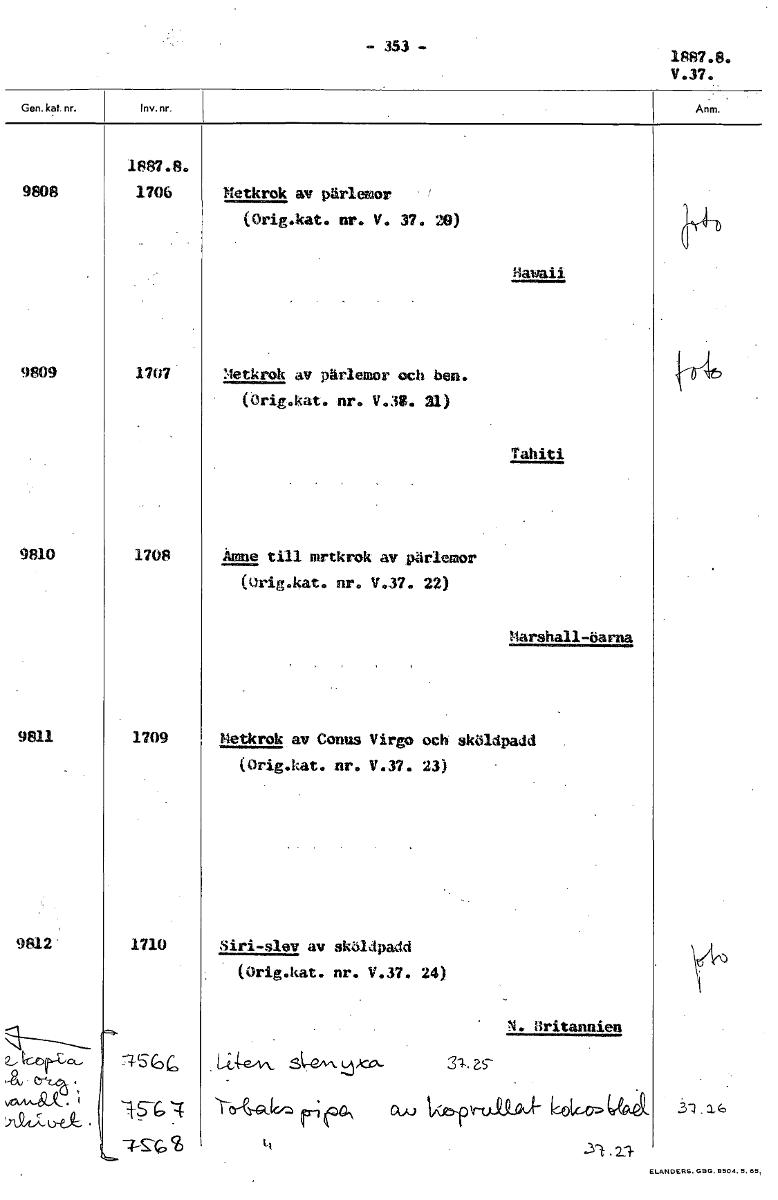 - 353 - 1887.8. V.37. 1887.8. 9808 1706 Metkrok av pärlemor (Orig.kat. nr. V. 37.. 29) Hawaii 9809 1707 Metkrok av pärlemor och ben. (Orig.kat. nr. V.33. 31) Tahiti 9810 1708 Ämne till mrtkrok av pärl...Visa hela