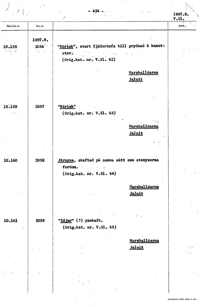 -434- 1887.8. V.51. 1987.8. 104-158 2056" "Bäriak" svart fjädertofs till prydnad å kanot- stav: (Orig.kat.,nr.,V.51.. 62) Marshallöarna. Jaluit 10.159 2057 "Bäriak" (Orig:kat. nr. V.51, 63) Marshall...