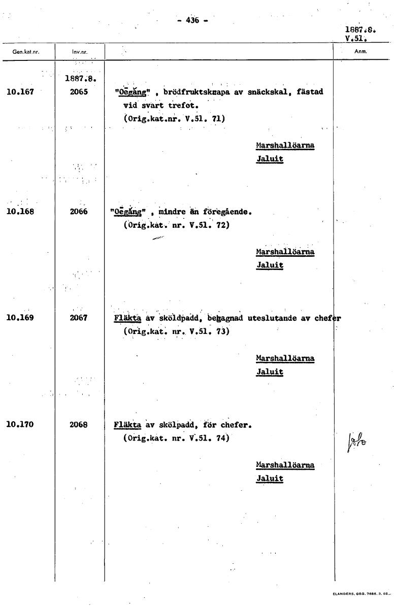 • - 436 - 1887.8. V.51. 1887.8. 10.167 2065 nekkg0" , brödfruktskuapa av snäckskal, fästad vid svart trefot. (Orig.kat.nr. V.51. 71) Marshallöarna Jaluit 10.168 2066 uegiår , mindre ån föregående. (örig... Visa hela