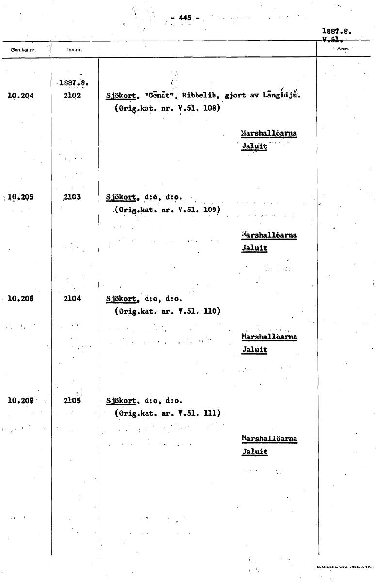 - 445:-- 1887.8. • .1867.8. 10.204 2102 Sjökort, "Oinit"„ Ribbelib, gjort av LingidA. (Orig.kat. nr. V.51. 108) Marshallöarna Jaluft 10.205 2103 Sjökort, d:o, d:o. (Orig.kat. nr. V.51. 109) Marshallöa...